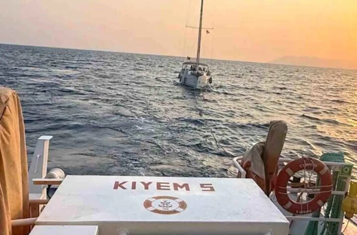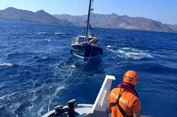 Muğla'nın Bodrum ilçesi açıklarında dümen arızası yapan yelkenli tekne, Kıyı Emniyet Genel Müdürlüğü takımları...