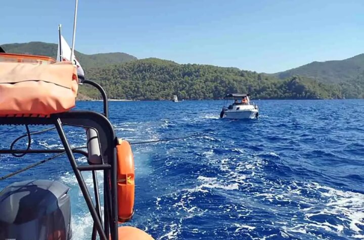 Muğla'nın Fethiye ilçesi açıklarında, içinde 3 kişi bulunan ve makine arızası nedeniyle sürüklenen 5...