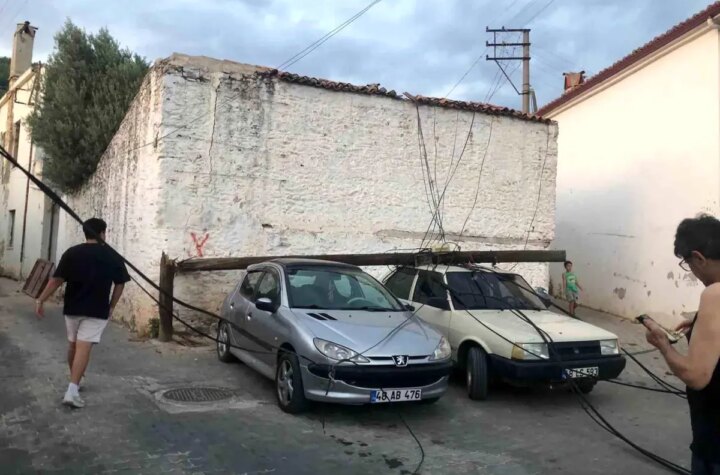 Muğla'nın Menteşe ilçesinde park halindeki iki arabanın üzerine devrilen ahşap telefon direği, büyük paniğe...