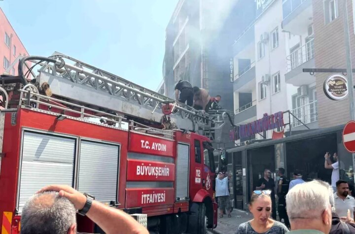 Aydın'ın Kuşadası ilçesinde bir apartmanda çıkan yangında, üst katta mahsur kalan vatandaş itfaiye grupları...