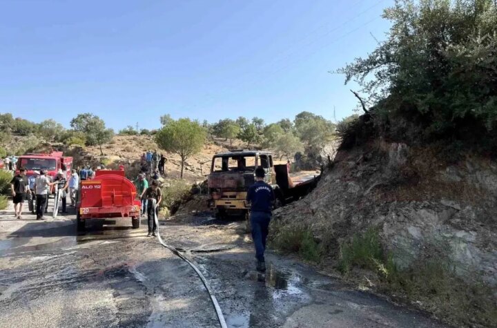 Aydın'ın Karpuzlu İlçesi'nde park halindeki bir kamyon şimdi belirlenemeyen bir nedenle yanarak kullanılamaz hale...